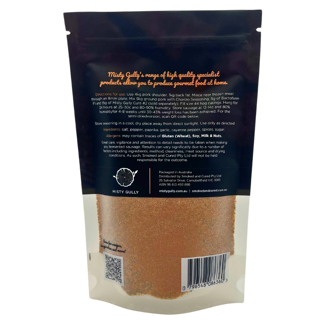 Directions for use: Use 4kg pork shoulder, 1kg back fat. Mince near frozen meat through an 8mm plate. Mix 5kg ground pork with Chorizo Seasoning, 5g of Bactoferm F1 and 15g of Misty Gully Cure #2. Fill size 44 hog casings. Hang for 24 hours at 25-30c and 80-90% humidity. Store sausage at 12-14c and 80% humidity for 4-8 weeks until 30-43% weight loss has been achieved. For the semi-dried version, see recipe section of this website.